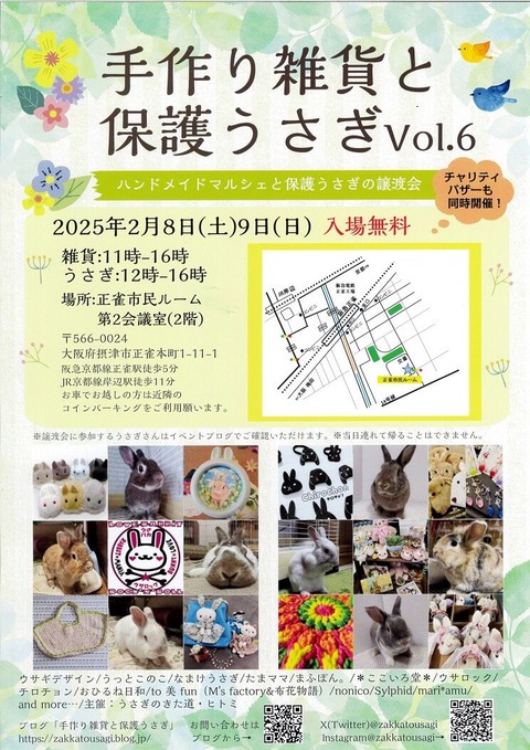 *更新情報2/7*譲渡会参加うさぎ情報掲載しました。出店者様キャンセル情報掲載しました。『手作り雑貨と保護うさぎ』 ハンドメイドマルシェと保護うさぎお見合い会のコラボイベントクリックで拡大 入場無料 日時 2025年2月8日(土曜日) 2...