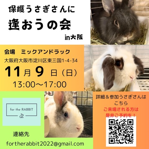 毎月恒例の『保護うさぎさんに逢おうの会in大阪』11月9日開催のご案内です。今回も、毎月会場をご提供くださっているうさぎ専門店 Mick and Luckさんにて開催します。11月は、11/3京都、11/9大阪、11/23梅っこ日和(摂津市...