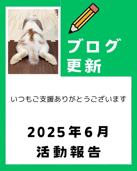 支援金収支報告・活動報告 2025年6月の活動報告 6月の活動報告です。 6月の収支報告は9月下旬に更新予定です。 2025.07.11 2025年6月の活動報告 : for the RABBIT【保護うさぎの里親探し】6月の活動報告です。 6月の収支報告は9月下旬に更新予定です。 もくじ トピック お見合い・トライアル・正式譲渡 通院の記録 移動 イベント 訃報 今後のイベントやお知らせ ご支援のお願い トピック 【6月の梅っこ現場における飼い主との交渉...