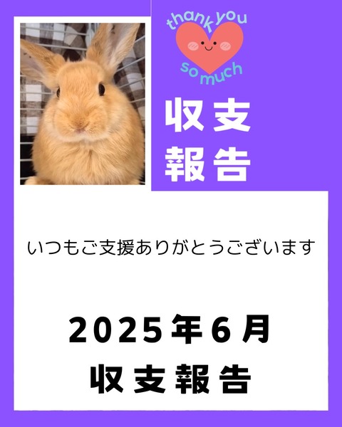 支援金収支報告・活動報告 収支報告 2025年6月収支報告 これからも保護うさぎたちの命と暮らしを守り続けられるよう、どうか引き続き温かなご支援・ご協力を賜れますと幸いです。 2025.09.26 2025年6月収支報告 : for the RABBIT【保護うさぎの里親探し】今回は6月分の収支報告です。6月の詳しい活動内容はこちらをご覧ください。 日々の活動を支えてくださる皆さまに、心より感謝申し上げます。 今回は6月の収支報告です。 6月は譲渡が着実に進み、譲渡費用が大きな支えとなりました。 一方で、通常のご...