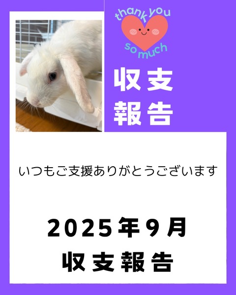 支援金収支報告・活動報告 収支報告 2025年9月収支報告 9月は大きな急病などの突発対応が少なく、収支自体は比較的落ち着いた月となりましたが、単月ではわずかな赤字となっています。 2025.12.26 2025年9月収支報告 : for the RABBIT【保護うさぎの里親探し】今回は9月分の収支報告です。 9月の詳しい活動内容はこちらをご覧ください。 9月も活動を支えてくださり、誠にありがとうございました。 9月は大きな急病などの突発対応が少なく、収支自体は比較的落ち着いた月となりましたが、単月ではわずかな赤字と...